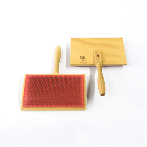 Tradisjonelle håndkarder fra Ashford, med buet kardeflate og rundt håndtak. Dette paret har et kardeklede som passer til de finere fibre.