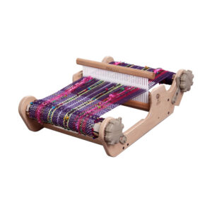 Systemet er det samme som på Ashford grindvev og Ashford Knitters Loom, altså en grindvev som er satt opp i en ramme. Det betyr at du kan sveipe på en renning og veve enkel toskaft.