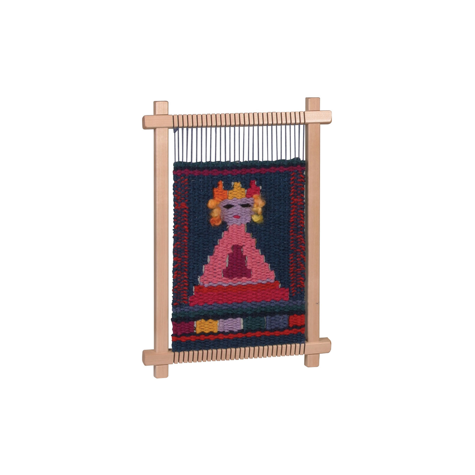 Enkel, men solid vevramme. Dette er en ukomplisert og intuitiv vev å eksperimentere med. Størrelsen gjør den lett å lagre, ta med seg, og bruke nærmest hvor som helst.