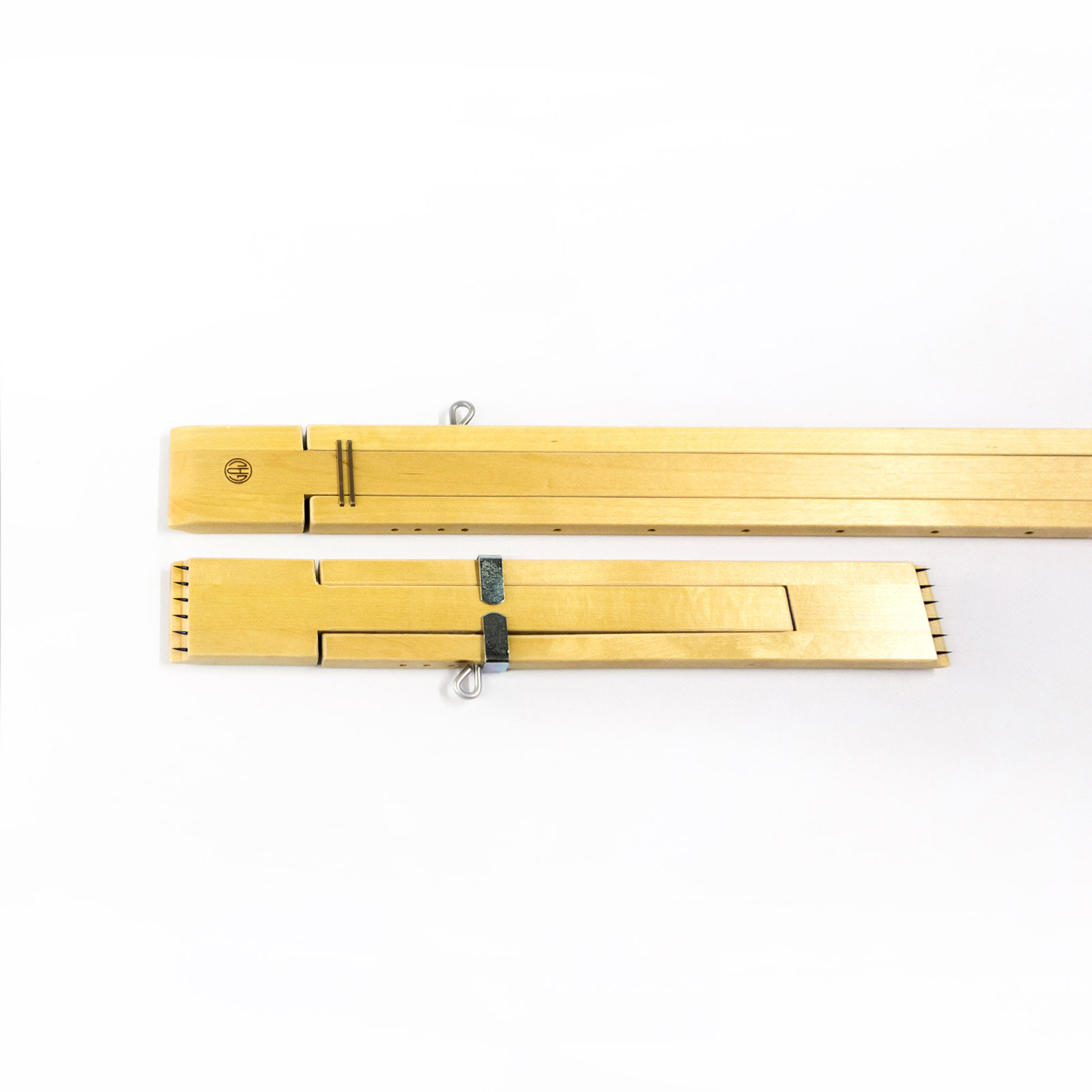Vevspenne i bjørk, med stålnåler. Et svært nyttig redskap som hjelper deg å holde jevn bredde på vevnaden. De fleste vil veve både raskere og penere med en god vevspenne.