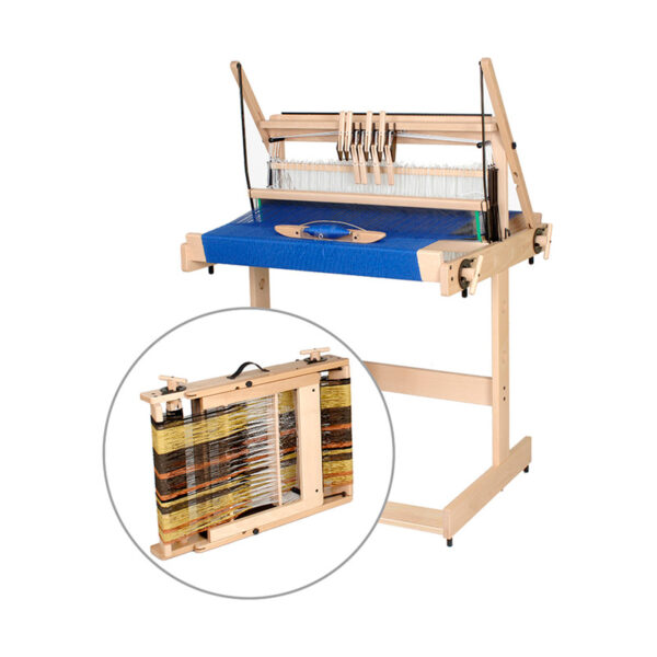 Bordveven Jane med 8 skaft er tilgjengelig i 40, 50 eller 70 cm vevbredde. Veven kan slås sammen for lagring eller transport, også etter at vevingen er påbegynt.