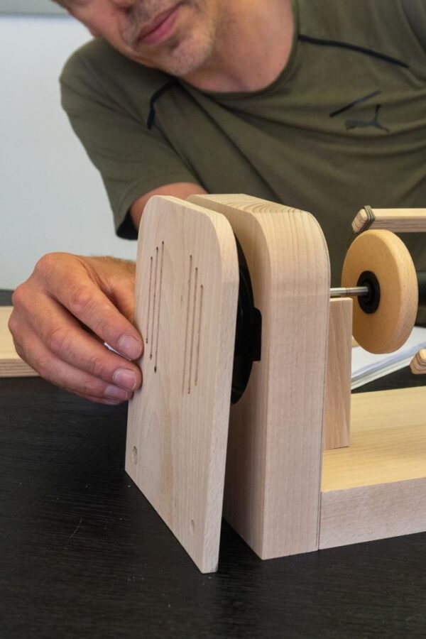 Louët Jenn-E er en ny, elekstrisk rokk med både spole- og vingebrems. Den beskyttende trekassen gir rokken en særegen Louët-stil og gjør det enkelt for brukeren å holde alt samlet.