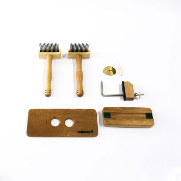 Majacraft ullkammer – dobbelrad, sett består av to ullkammer, beskyttelsesplate i tre (for oppbevaring) og en diz, samt skrutvinge og base for å feste en av kammene til bordet.