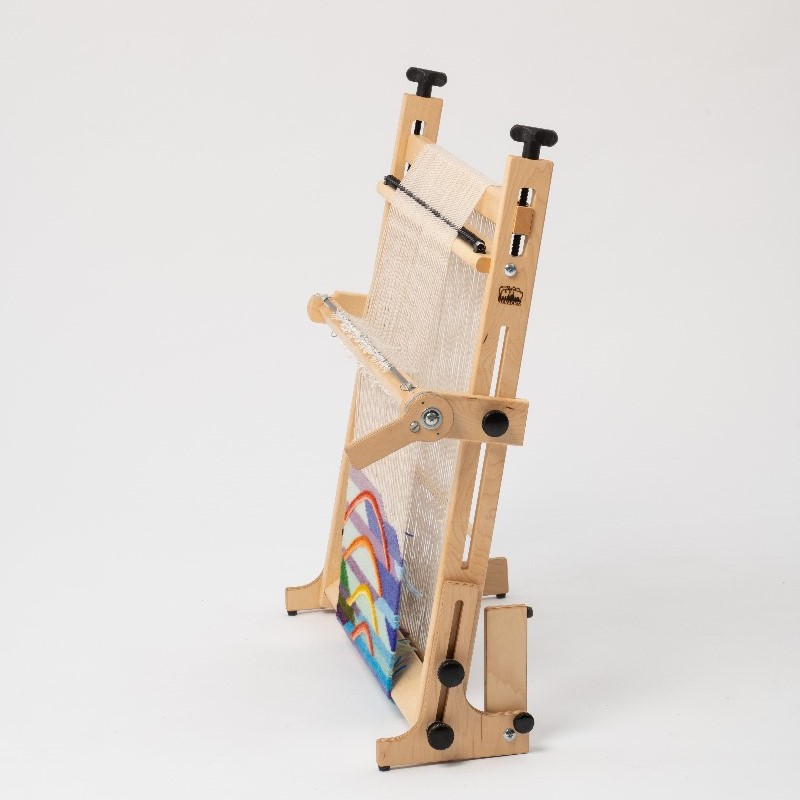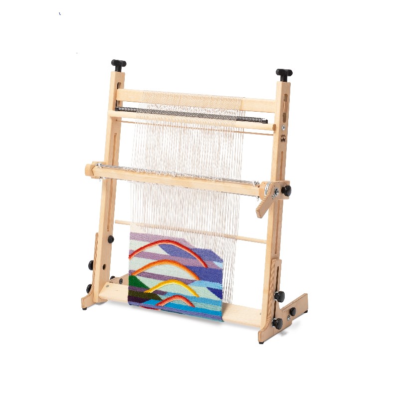 Schacht Arras er en solid og gjennomtenkt billedvevramme i høy kvalitet, med presise justeringsmuligheter som gir deg full kontroll over spenning og vevteknikk. Vevbredden er 50 cm, og vevlengden er ca. 90 cm (kan utvides med tilleggsutstyr).