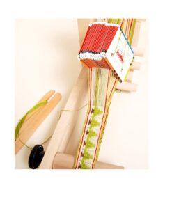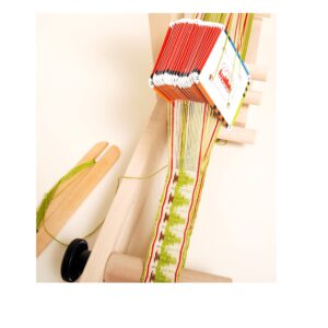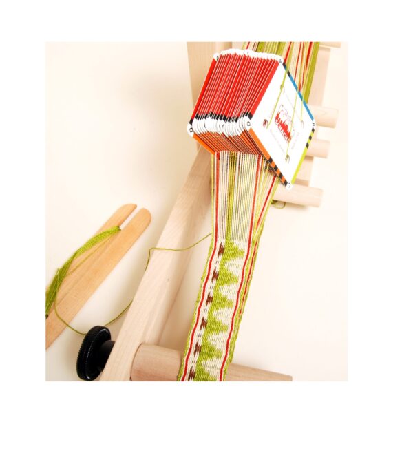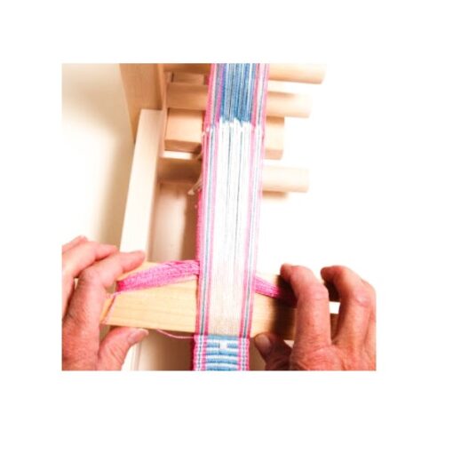 Med denne båndveven fra Schacht kan du veve alle slags bånd, opptil 2,5 meter i lengde. Dette er en enkel og behagelig måte å veve bånd på. Båndveven står stødig på et bord, og du kan gå fra og til uten å måtte løsne på et eneste vevbelte. Det følger med en Schacht båndskyttel.