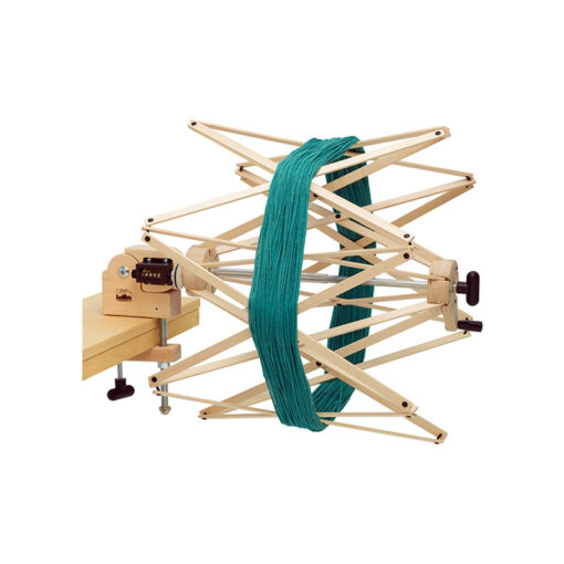 Den snurrer jevnt og lett og har en praktisk sveiv på toppen. Den kan vippes i to ulike posisjoner, og slås sammen som en vanlig garnvinde når den ikke er i bruk.
