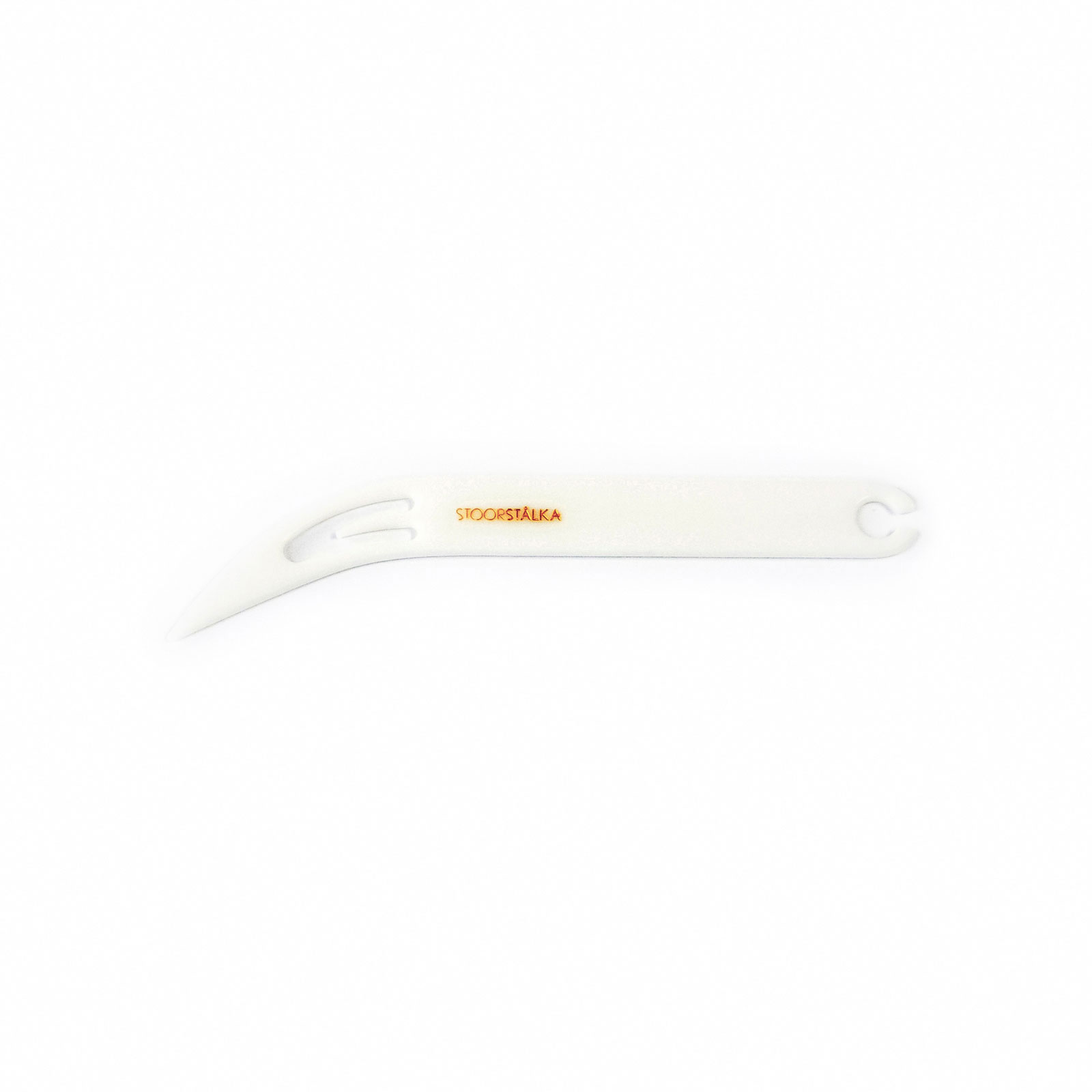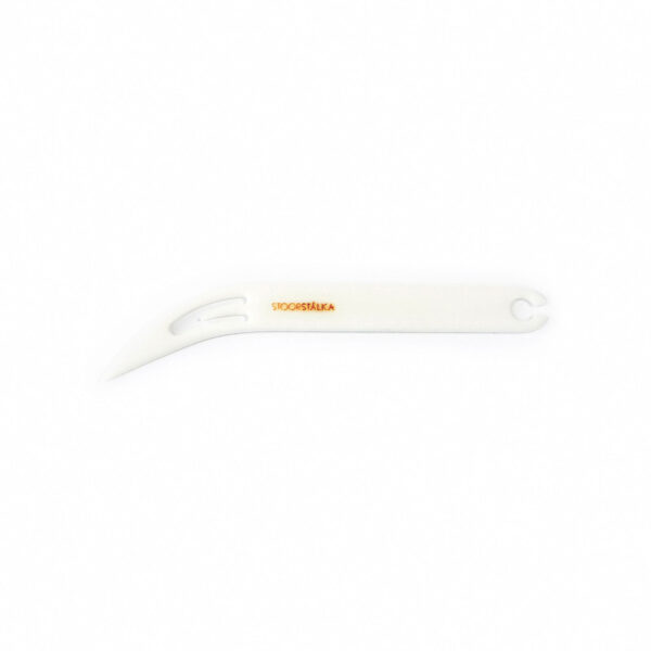 Denne båndskyttelen er utformet som en tradisjonell, samisk skyttel. Når du vever med plukkmønster gjør den bøyde spissen det enkelt å plukke riktige tråder. Den gjør også at du kan holde skyttelen på en mer komfortabel måte når du jobber.